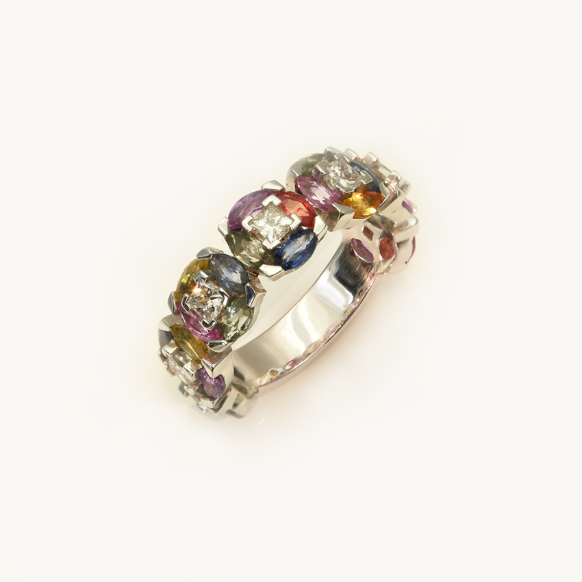 18 carats white gold – around 6,40g – mixed sapphires (4,24 carats) – diamonds (0,38 carat)