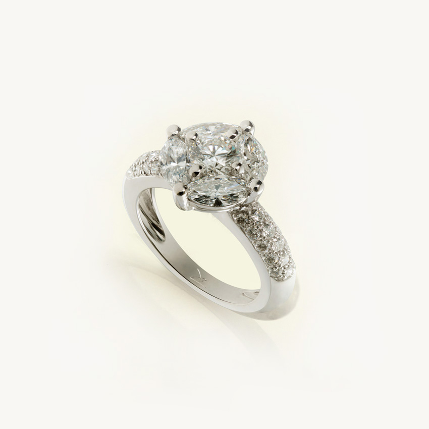 When jewelry and illusion come together. Like a composer of great music, when David VANGELDER created his marquise line, he conceived a harmonious and immaculate assembling of different shaped stones, united as one to offer a brilliant explosion of light.